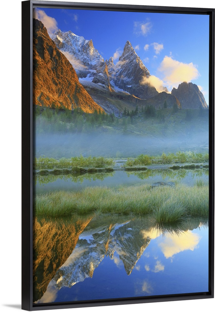 <p>Italy, Aosta Valley, Courmayeur, Val Veny, Alps, Aiguille Blanche (left) and Noire (center) de Peuterey (in the Mont Blanc Group) reflecting over small lake in the Piano del Combal.</p>