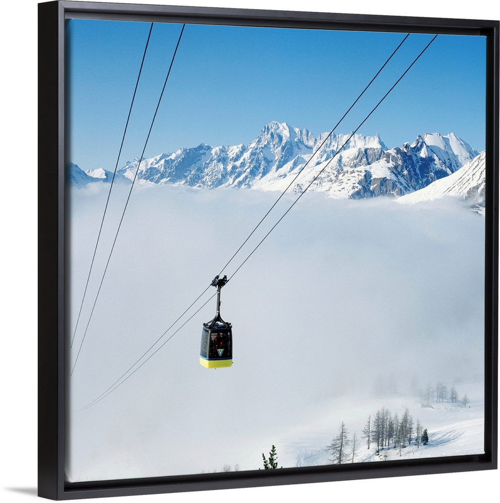 <p>Italy, Italia, Aosta Valley, Valle d'Aosta, La Thuile, Les Suches cableway and Grandes Jorasses mountain in background</p>