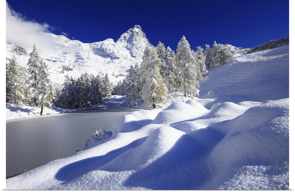 <p>Italy, Aosta Valley, Alps, Mediterranean area, Aosta district, Valtournenche, Lake Blue (near Breuil-Cervinia) and the Mt Cervino (Matterhorn) covered in snow.</p>