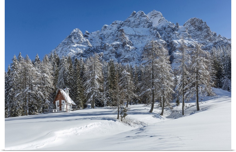 <p>Europe, Italy, Veneto, Belluno. Little church at Duran pass with San Sebastiano mountain on the background, municipality of La Valle Agordina, Dolomites</p>