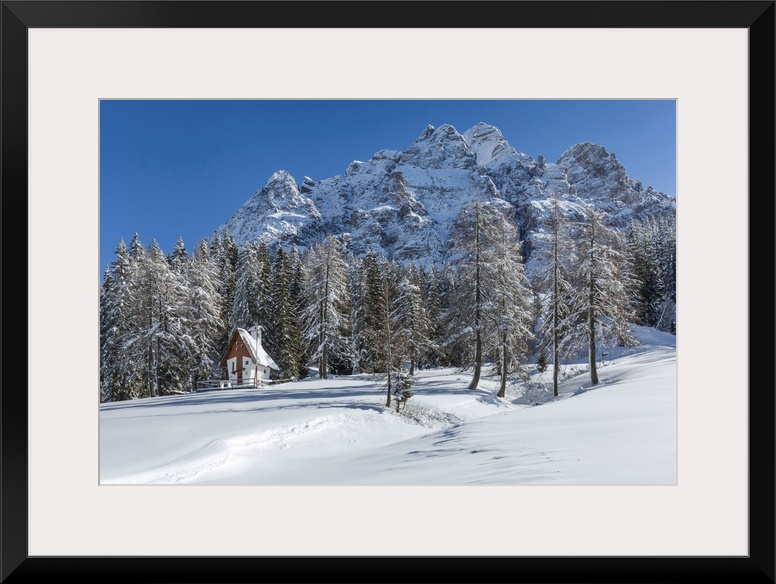 <p>Europe, Italy, Veneto, Belluno. Little church at Duran pass with San Sebastiano mountain on the background, municipality of La Valle Agordina, Dolomites</p>