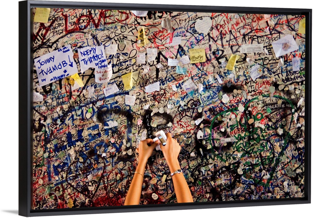 <p>Italy, Italia, Veneto, Verona, A girl leaves a love message at the entrance to Juliet's House</p>
