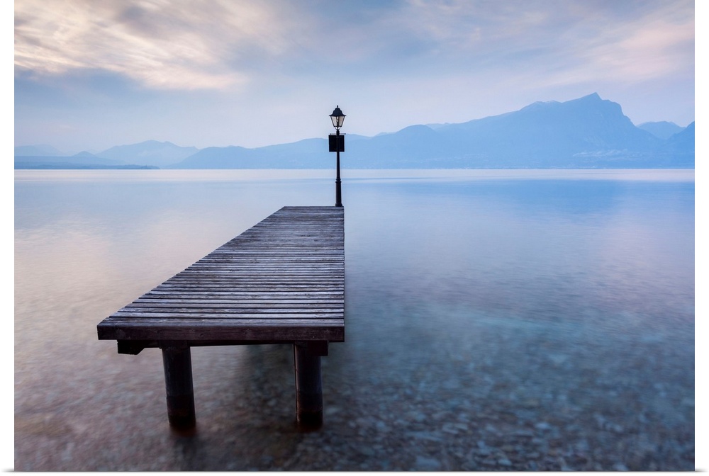<p>Italy, Veneto, Verona district, Lake Garda, Punta San Vigilio, Bay of sirens, Pier and lake at twilight.</p>