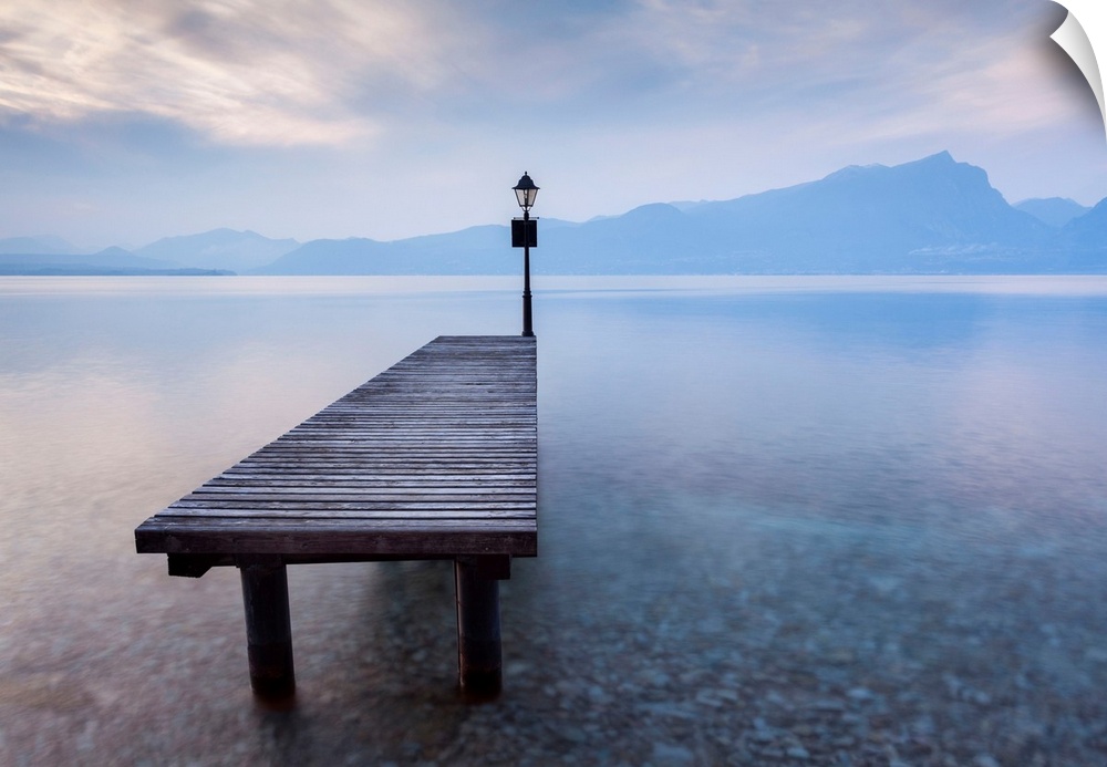 <p>Italy, Veneto, Verona district, Lake Garda, Punta San Vigilio, Bay of sirens, Pier and lake at twilight.</p>