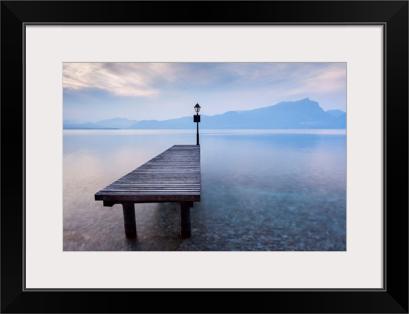 <p>Italy, Veneto, Verona district, Lake Garda, Punta San Vigilio, Bay of sirens, Pier and lake at twilight.</p>