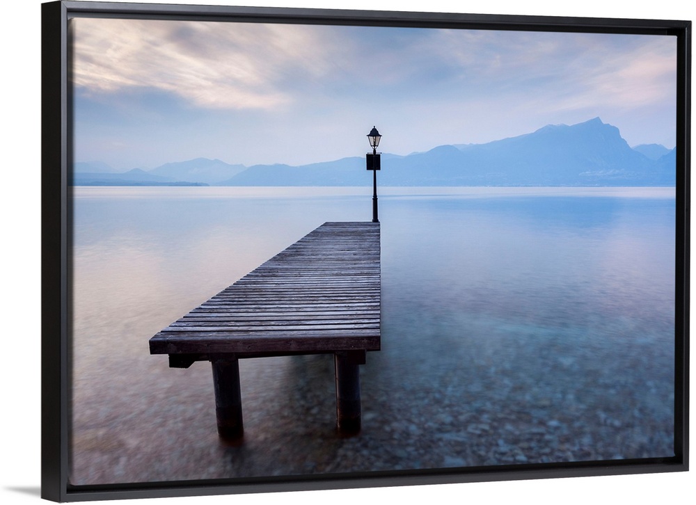<p>Italy, Veneto, Verona district, Lake Garda, Punta San Vigilio, Bay of sirens, Pier and lake at twilight.</p>