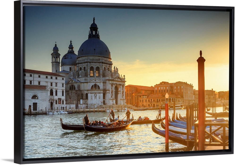 <p>Italy, Venice, Gondolas and the Santa Maria della Salute church at sunset.</p>