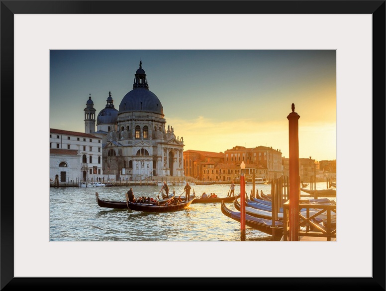 <p>Italy, Venice, Gondolas and the Santa Maria della Salute church at sunset.</p>