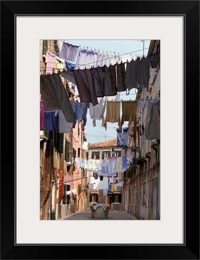 <p>Italy, Venice, lines of washing hanging between buildings in sunny street</p>