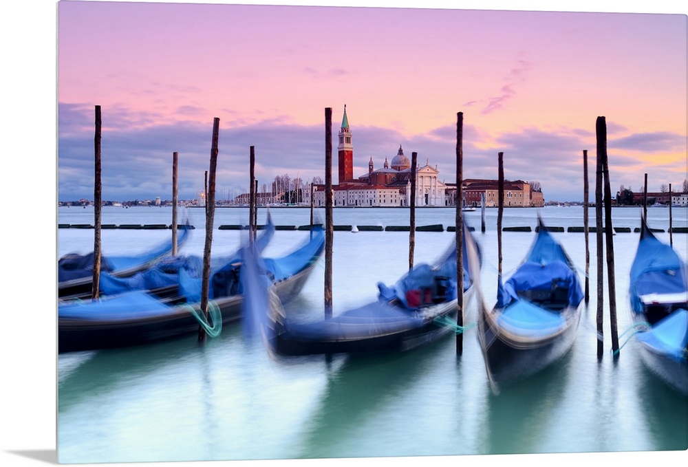 <p>Italy, Mediterranean sea, Venetian Lagoon, Adriatic Coast, Venice, San Giorgio Maggiore, View from St Mark square towards San Giorgio Maggiore with gondolas in the foreground</p>