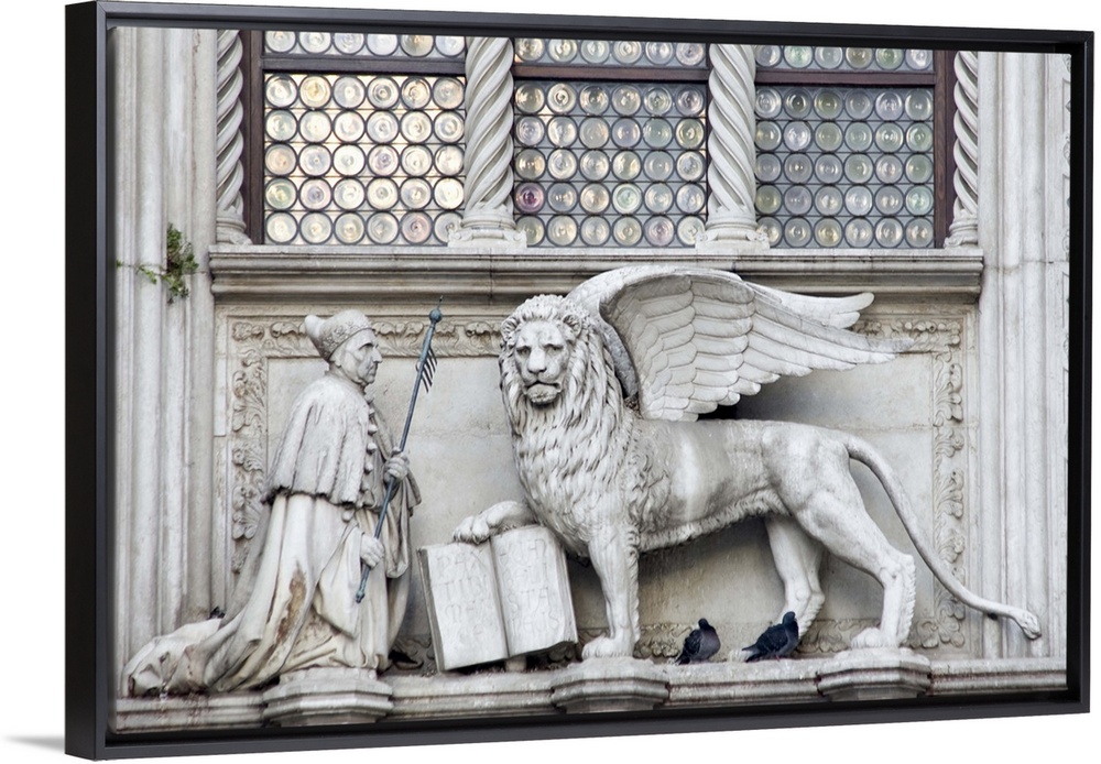 <p>Europe, Italy, Venice. Statue of a winged lion and the Doge on the Doge's Palace.</p>