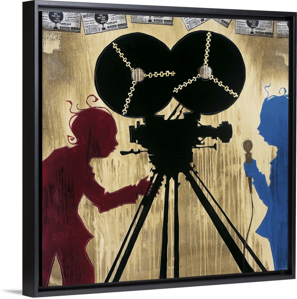 <p>A painting of a camera man in red silhouette pointing a camera at man in blue silhouette holding a microphone.</p>