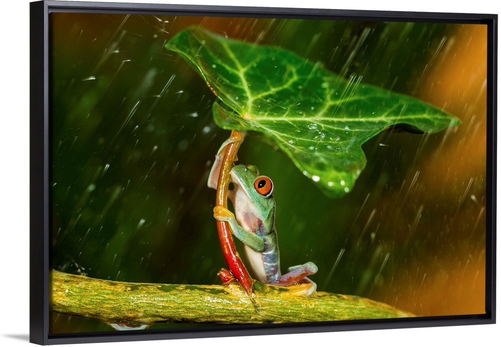 <p>A small tree frog using a leaf as an umbrella.</p>