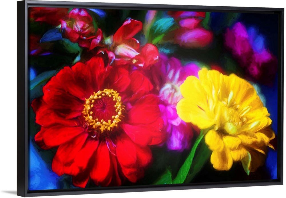 <p>Close-up photograph of yellow, purple, and red flowers with a painted look finish.</p>