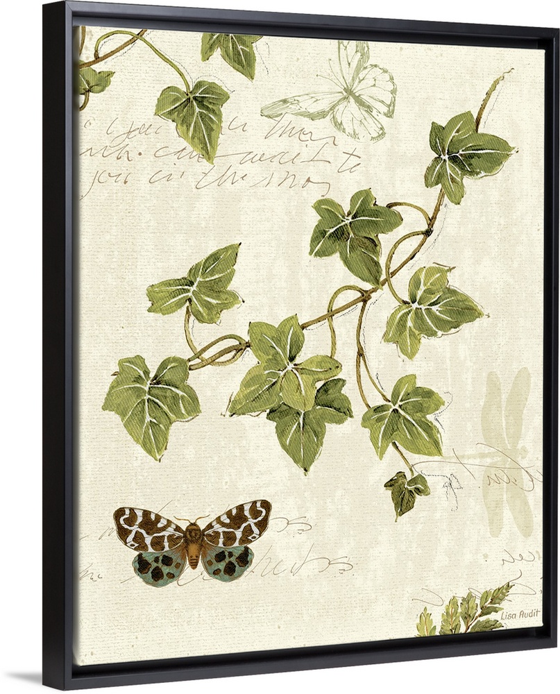 <p>Botanical illustration featuring green ivy twigs and butterflys on a neutral background with cursive handwriting scattered throughout.</p>