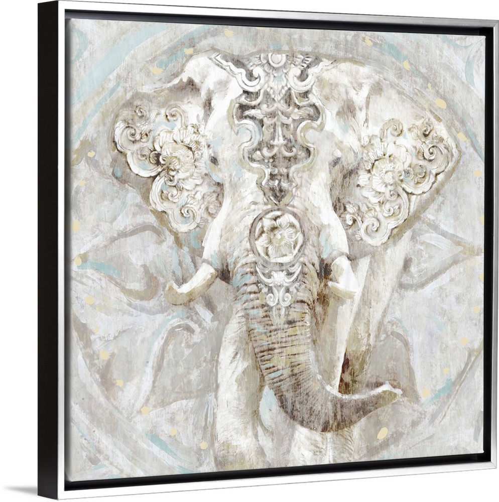 <p>Artwork of an elaborately decorated elephant over a circular sunburst motif.</p>