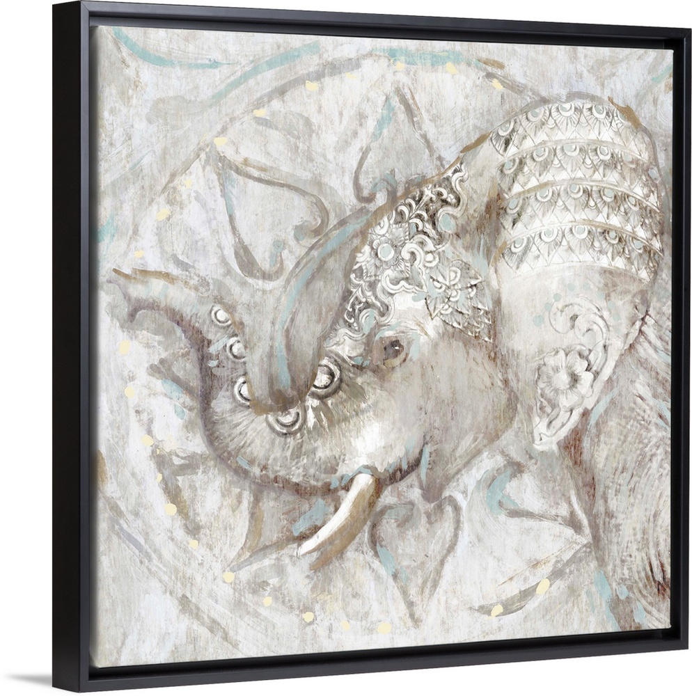 <p>Artwork of an elaborately decorated elephant over a circular sunburst motif.</p>