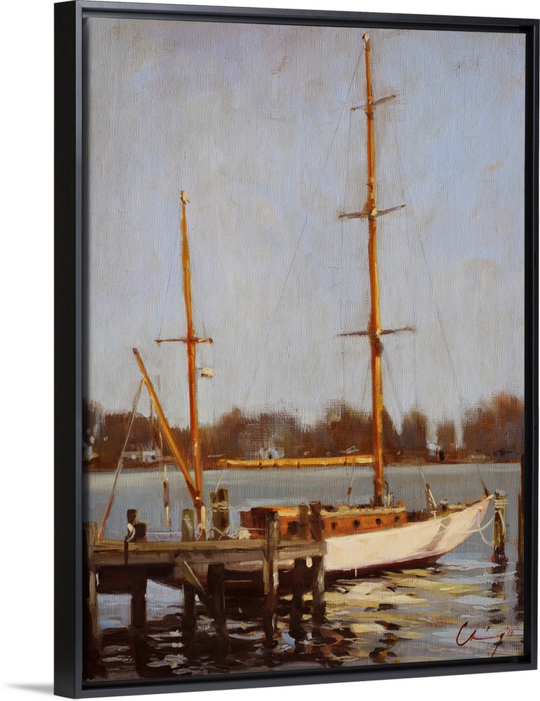 <p>A painting of a sailboat docked at a harbor with its sails down.</p>