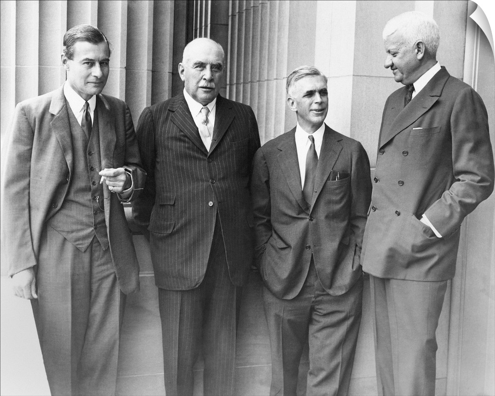<p>J.P. Morgan Jr. with a few of his partners at the Senate Banking and Currency Committee hearings. May 31, 1933. L-R: Julius Morgan, son; J.P. Morgan Jr.; Harold Stanley, partner; and R C. Leffingwell, partner. The Committee investigated the business practices of the Morgan Bank and their possible contribution to the 1929 financial market crash.</p>