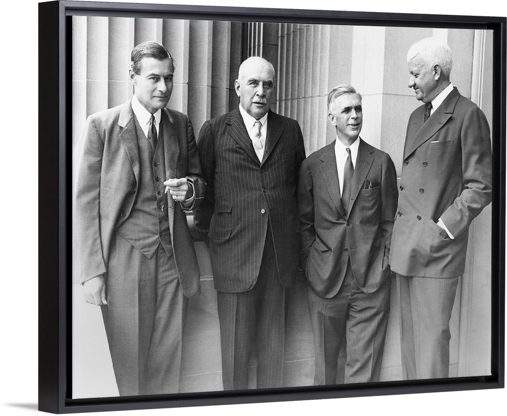 <p>J.P. Morgan Jr. with a few of his partners at the Senate Banking and Currency Committee hearings. May 31, 1933. L-R: Julius Morgan, son; J.P. Morgan Jr.; Harold Stanley, partner; and R C. Leffingwell, partner. The Committee investigated the business practices of the Morgan Bank and their possible contribution to the 1929 financial market crash.</p>