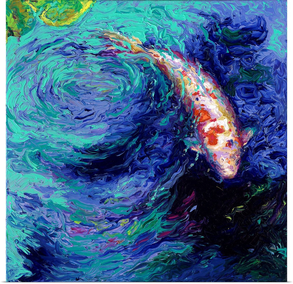 <p>Brightly colored contemporary artwork of a single koi fish in a pond.</p>