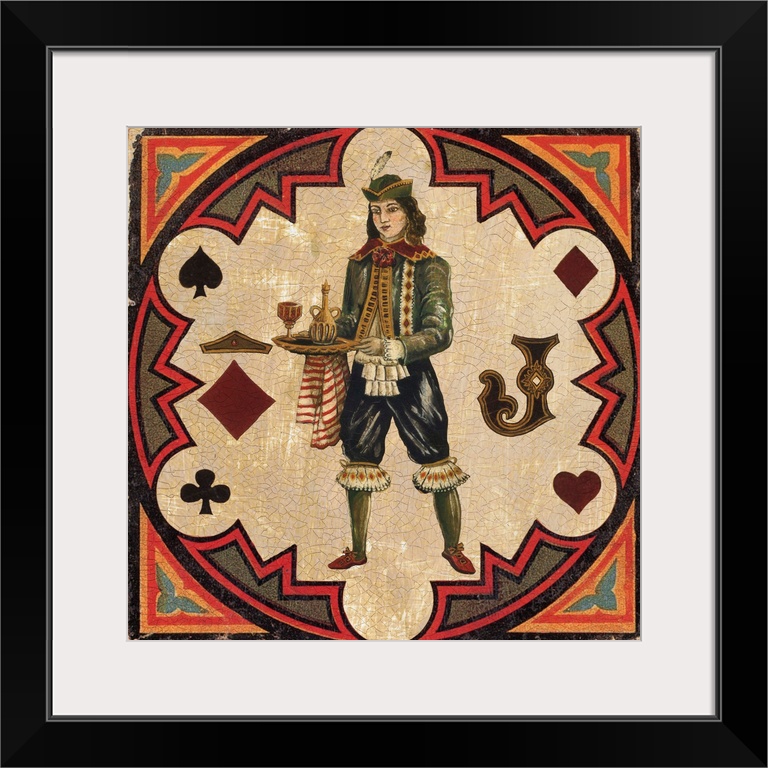 <p>Square vintage illustration of a Jack inside a circular design with a heart, spade, clover, and diamond surrounding him.</p>