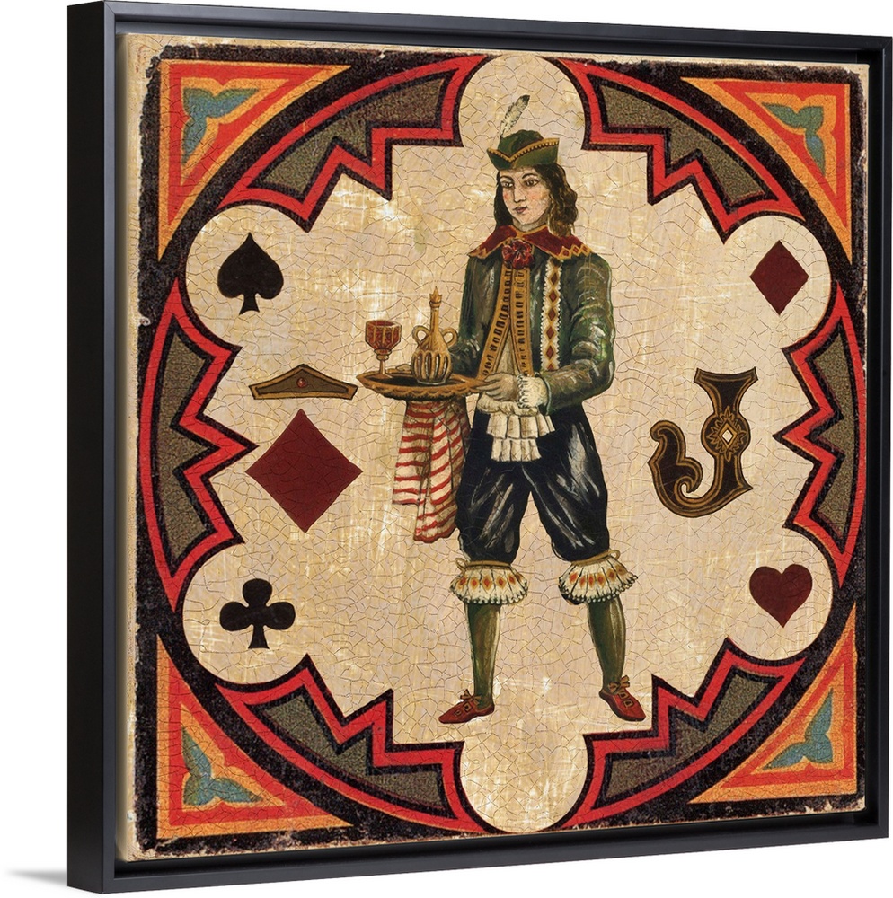 <p>Square vintage illustration of a Jack inside a circular design with a heart, spade, clover, and diamond surrounding him.</p>