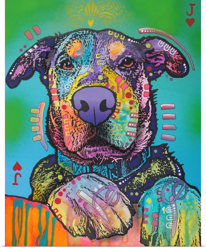 <p>Colorfully designed painting of a dog with its paws in the foreground on a blue and green background and a Jack of Hearts symbol in the top corner.</p>