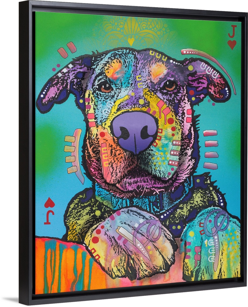 <p>Colorfully designed painting of a dog with its paws in the foreground on a blue and green background and a Jack of Hearts symbol in the top corner.</p>