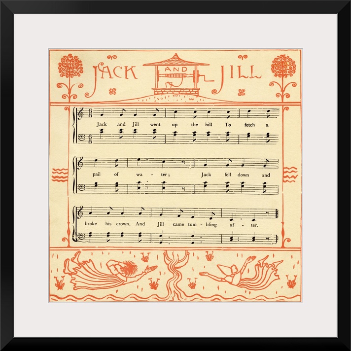 <p>Jack and Jill, nursery rhyme score, illustration (1877) by Walter Crane (1845-1915). English artist of Arts and Crafts movement, 15 August 1845-14 March 1915 From Baby's Opera (A book of old rhymes with new dresses) by Walter Crane, page 52.</p>
