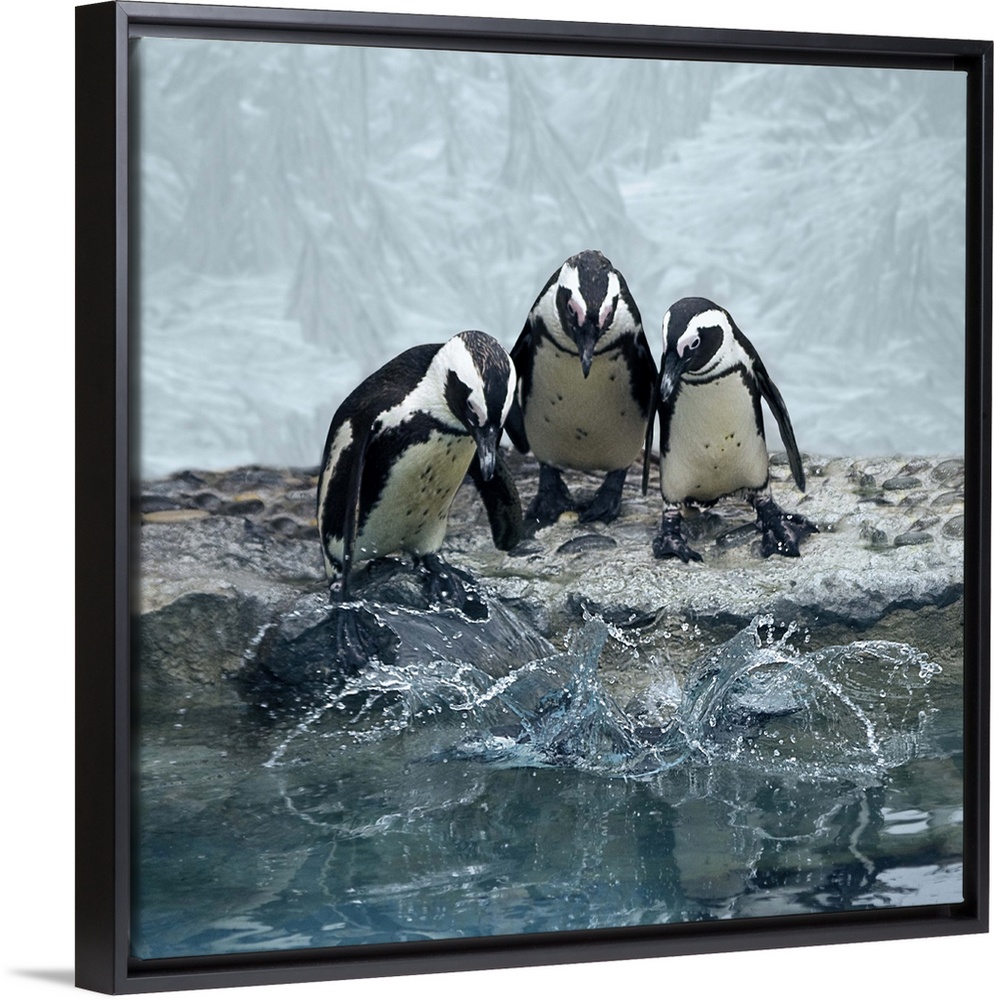 Jackass penguins overlooking water before diving all together.