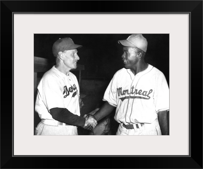 <p>John Roosevelt Robinson, known as Jackie. American baseball player. As a member of the Montreal Royals, the top minor-league affiliate of the Brooklyn Dodgers, shaking hands with Dodger manager Leo Durocher (left) at a spring training exhibition game in Havana, Cuba, March 1947, one month before making his major league debut.</p>