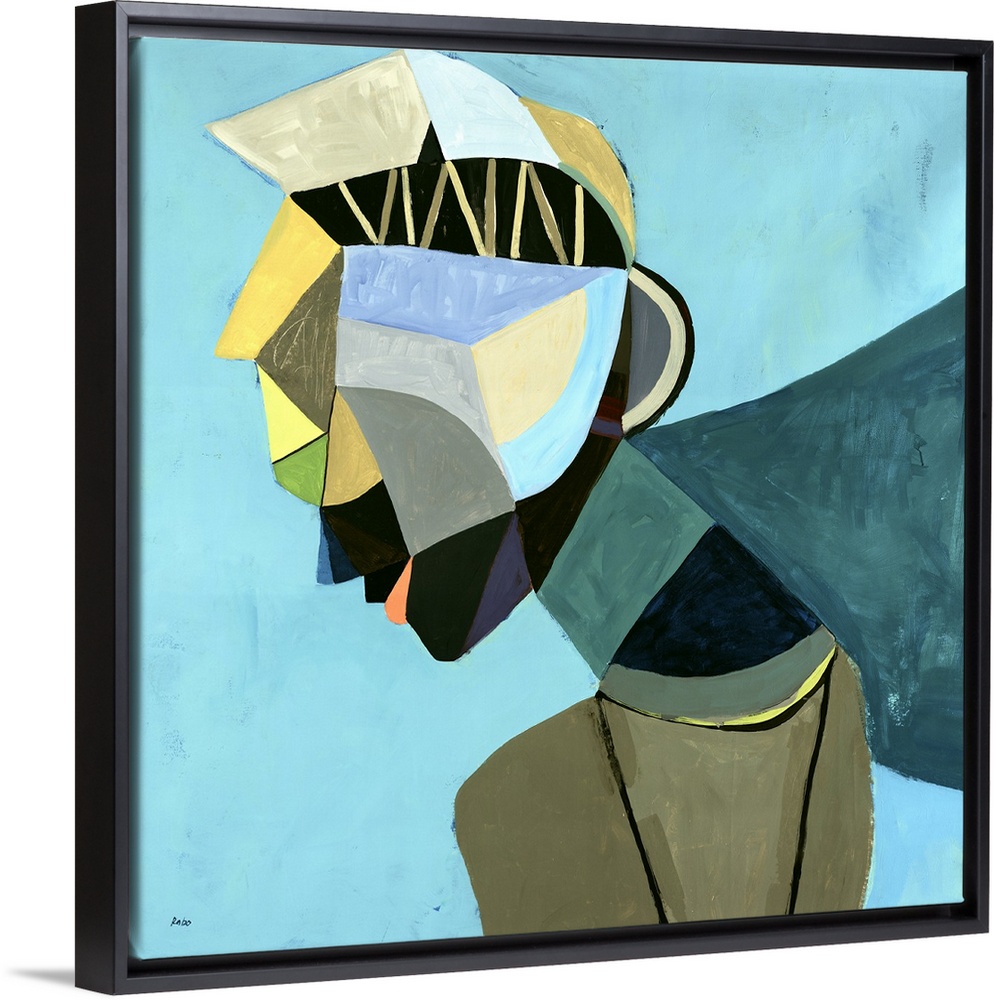 <p>Abstract painting of the profile of a woman wearing a colorful head piece, on a cool background of blues.</p>