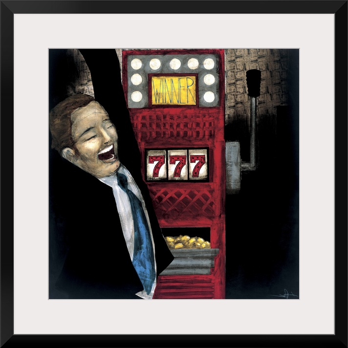 <p>A painting of a man cheering from winning tons of money from a casino slot machine.</p>