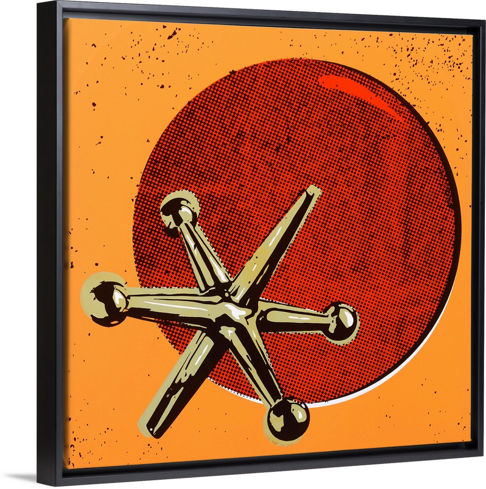 <p>Contemporary pop art style artwork of a jacks and ball set against an orange background.</p>