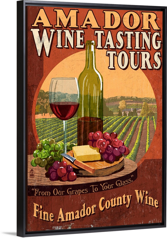 <p>A stylized retro art poster of vineyards in the background and a small platter of grapes, cheese, wine in a bottle, and glass in the foreground.</p>