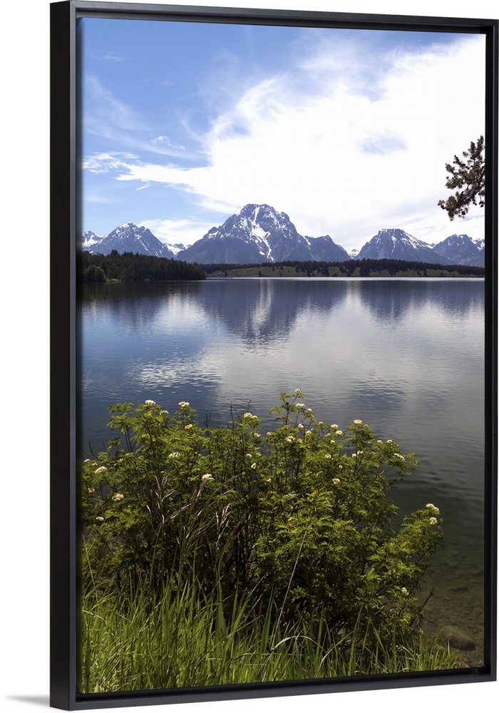 <p>View of Jackson lake with snow mountain in background against blue sky.</p>