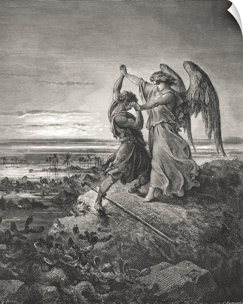 <p>Engraving From The Dore Bible Illustrating Genesis XXXII 24 To 32, Jacob Wrestling With The Angel, By Gustave Dore, 1832-1883, French Artist And Illustrator.</p>