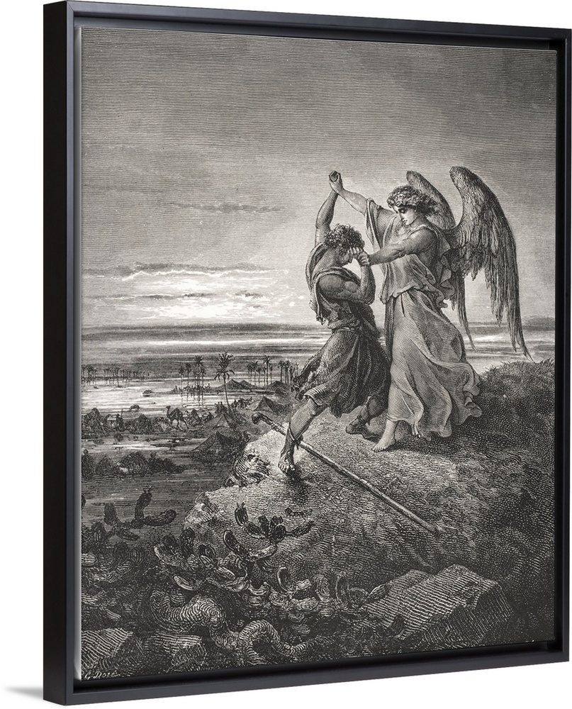 <p>Engraving From The Dore Bible Illustrating Genesis XXXII 24 To 32, Jacob Wrestling With The Angel, By Gustave Dore, 1832-1883, French Artist And Illustrator.</p>