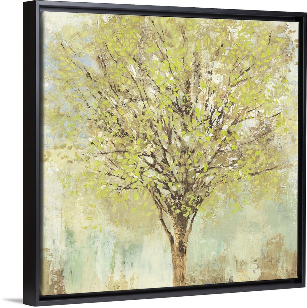 <p>Contemporary artwork of a tree with leafy branches in pale shades of green, blue, and brown.</p>