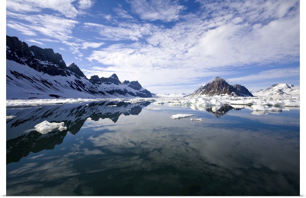 <p>Jagged coastal peaks casting reflections in cold Arctic waters.</p>