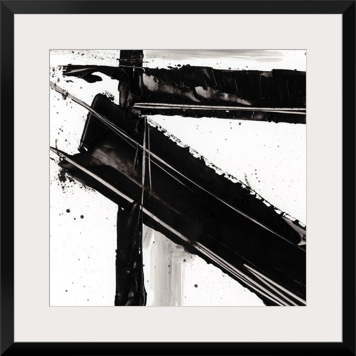 <p>Abstract painting of chaotic wide black brush strokes with overlaying splatters of black.</p>