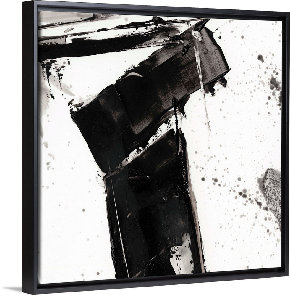 <p>Abstract painting of chaotic wide black brush strokes with overlaying splatters of black.</p>
