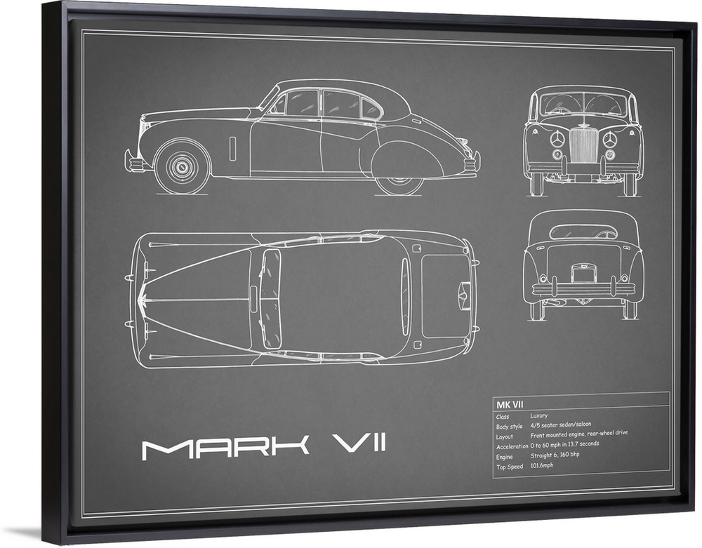 <p>Antique style blueprint diagram of a Jaguar MkVII printed on a Grey background</p>
