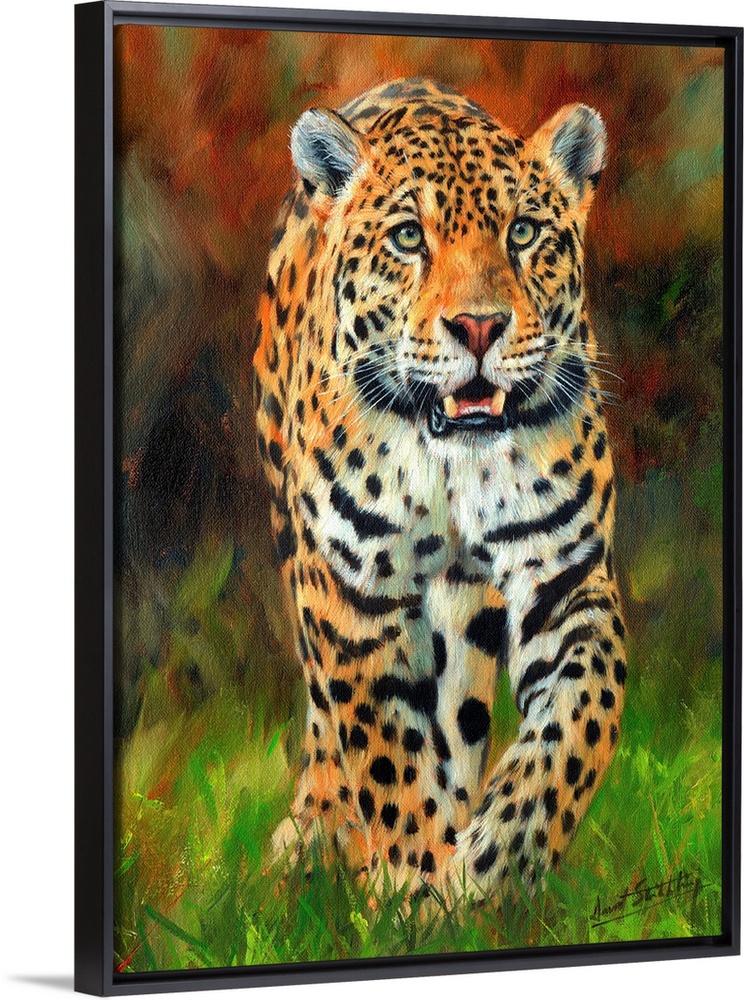 <p>Contemporary painting of a jaguar walking across lush green grass.</p>