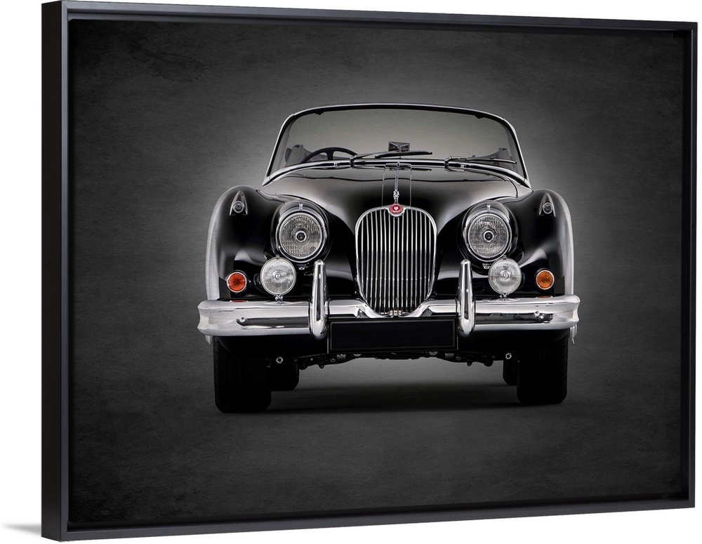 <p>Photograph of a black 1958 Jaguar XK150 printed on a black background with a dark vignette.</p>