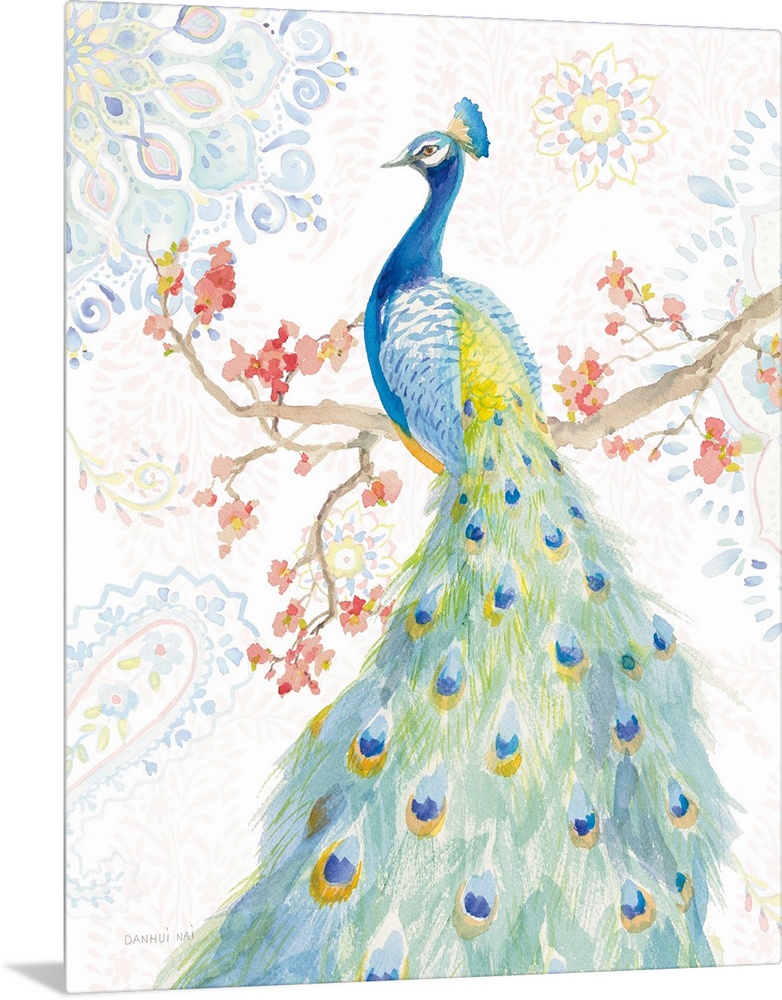 <p>Contemporary artwork featuring a watercolor peacock resting on a branch with mandala designs in the background.</p>