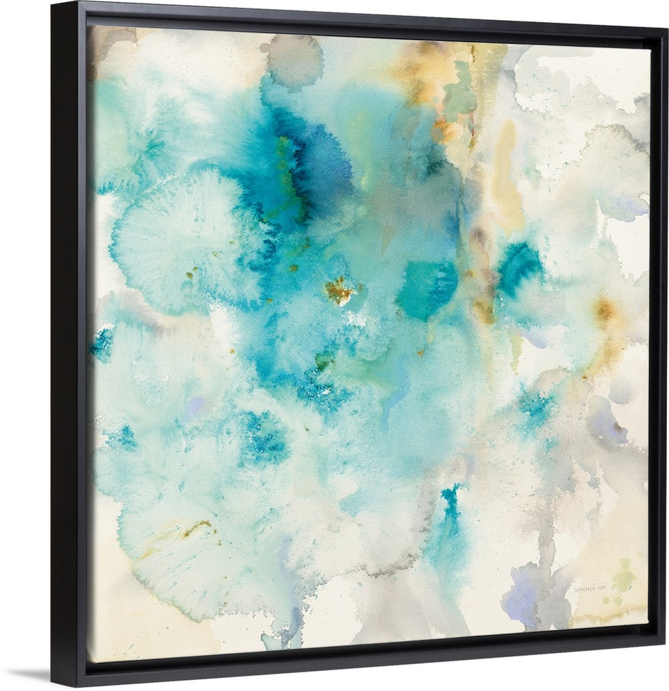 <p>Contemporary artwork featuring blue watercolor bleeds with neutral colors.</p>