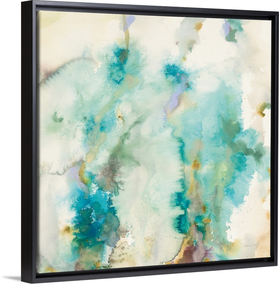 <p>Contemporary artwork featuring blue watercolor bleeds with neutral colors.</p>