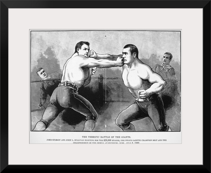 <p>Jake Kilrain (left) and John L. Sullivan in the 75-round contest (8 July 1889) at Richburg, Mississippi, won by Sullivan in his last bare-knuckle fight. Contemporary engraving from the 'Police Gazette.'</p>